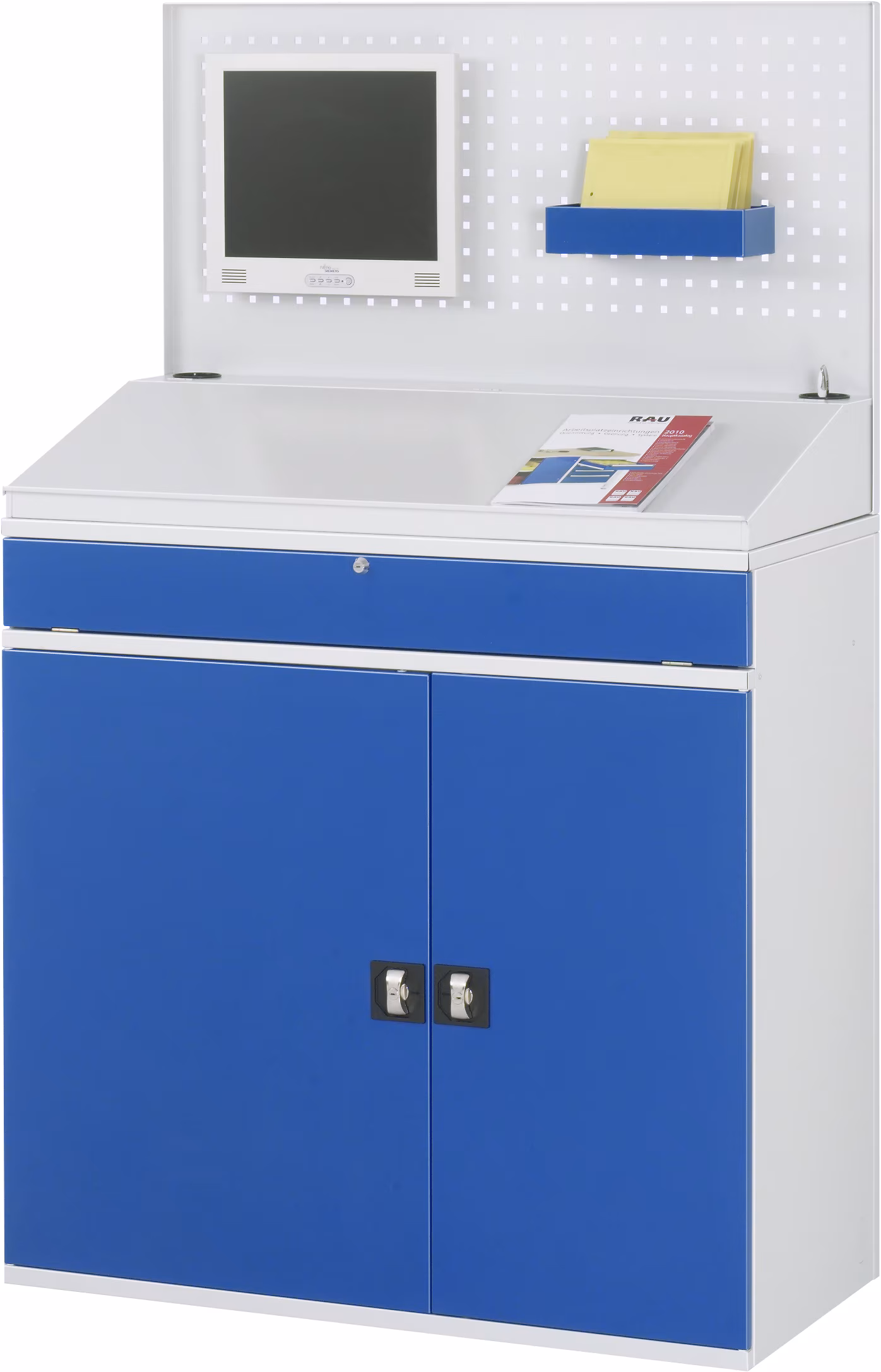 Lochplattenrückwand mit 2 Bohrbildern (VESA MIS-D 75/100) zur Montage eines Flachbildschirms. Mit 4-Kant Systemlochung (Lochung 10x10 mm, Abstand Lochmitte-Lochmitte 38 mm) zur Aufnahme von Lochplatten-Zubehör.Schreibaufsatz mit Klappdeckel (vorne mit Anschlagleiste) und Stiftbecher. Auflagenhöhe 400 mm. Basisschrank geteilt in separat nutz- und bedienbares Tastatur- und Flügeltürfach. Kabeldurchlässe an der Schrankrückseite, im Deckel sowie im Innenteil. Tastaturfach(Höhe 120 mm) mit Frontklappe (abschließbar) und Tastaturauszug. Tastaturauszug B1020 x T450 mm zur Tastatur- und Mausauflage (Auszug 80 %, Tragkraft 20 kg, Rastpunkt). Flügeltürfach (Höhe 850 mm) mit Doppel-Flügeltür (Öffnungsweite ca. 100°, abschließbar), Mittelstütze zur Teilung der Einbaubreite in 1xB650 mm (links) und 1xB450 mm (rechts) und mit folgender Inneneinteilung (Einbauhöhe verstellbar): links: 1 x Auszugstablar B650 x T450 mm (Auszug 80 %, Tragkraft 20 kg, Rastpunkt). 1 x Innenschublade B650 x T450 mm (Auszug 100 %, Tragkraft 35 kg). rechts: 1 x Auszugstablar B450 x T450 mm (Auszug 80 %, Tragkraft 20 kg, Rastpunkt). 1 x Innenschublade B450 x T450 mm (Auszug 100 %, Tragkraft 35 kg). Pulverbeschichtung Belastbarkeit gesamt max. 200 kg Lieferung komplett montiert Qualitätsgarantie 5 Jahre Made in Germany