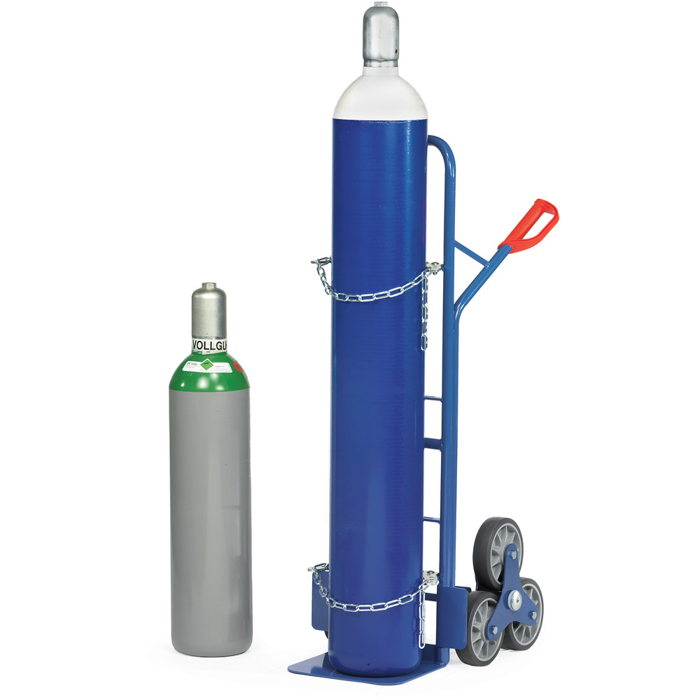 Stahlflaschen-Treppenkarre in stabiler Schweißkonstruktion mit Stahlblechschaufel, pulverbeschichtet blau RAL 5007. Sicherheitsgriffe. Mit 2 dreiarmigen Rad-Sternen, jeweils 3 TPE-Räder 160 mm Ø, Naben mit Kugellager. Für den Transport von 20, 40 und 50-Liter-Gasflaschen oder 11 und 33 kg Propangasflaschen auch über Treppen. Als Basis dient die Treppenkarre TK1325, zusätzlich ausgerüstet mit 4 gelochten Querstreben zum Anschrauben der Flaschenhalterungen mit Sicherungsketten. Bügel oben und Querstreben durchgebogen. Für den sicheren Transport von runden Gütern, wie Rollen, Kannen, Eimern usw. Zerlegte Anlieferung.