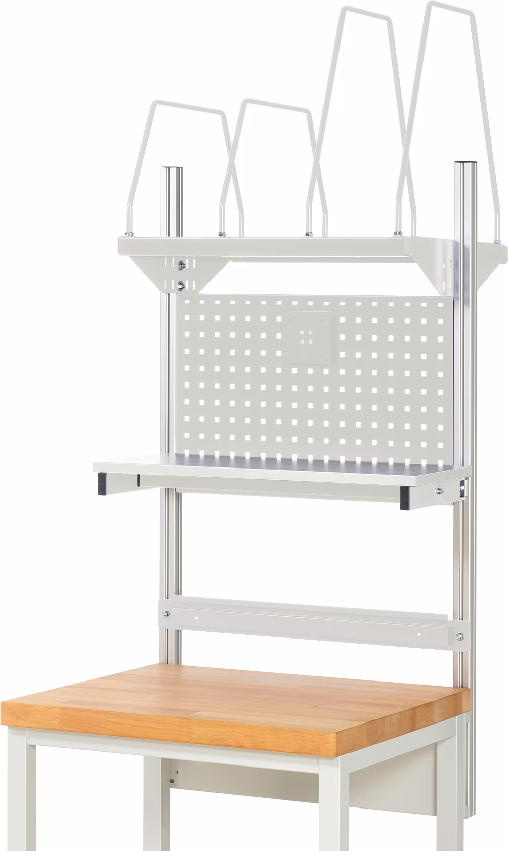 Der Befestigungssatz (Querträger) wird hinten unter der Arbeitsplatte an den Systemunterbau angebracht. Die 2 System-Stützen (Aluminiumprofil 40x40 mm) werden mittels Nutensteinen an den Befestigungssatz (Querträger) angeschraubt (Höhe einstellbar) und laufen hinter der Arbeitsplatte nach oben, so dass die gesamte Tiefe der Arbeitsplatte frei bleibt (kein Verschrauben auf der Arbeitsplatte). Die System-Stützen verfügen an allen 4 Seiten über eine Profilnut, so dass eine allseitige Nutzung möglich ist.Die 2 System-Stützen werden links und rechts außen angeschraubt, so dass 1 Systemfeld in der Systembreite 750 mm entsteht. Nutzhöhe 1130 (ab Oberkante Arbeitsplatte). Geeignet für: Arbeitstische Serie Jerry und Tom, Werktische Serie 900, Werkbänke Serie 8000, Werkbänke Serie 7000, Fahrbare Werkbänke Serie 8000, Werkbänke mit Fahrgestell Serie 8000, Schubladenschränke Serie 7000, Montagewagen Serie 7000, Elektrisch Höhenverstellbare Arbeitsplätze Serie adlatus 300 und 600. Montage an: Systemunterbau. Aufnahme von: Anbauelemente (System-Zubehör). 1 x Befestigungssatz (Querträger) mit 2 System-Stützen (ergibt Systembreite 1x750 mm). 1 x Lochplatte B665 x H450 mm. Mit 4-Kant Systemlochung (Lochung 10x10 mm, Abstand Lochmitte-Lochmitte 38 mm) zur Aufnahme von Lochplatten-Zubehör. 1 x Etagenbord B750 x T300 mm; Melaminharzbeschichtete Platte. 1 x Halteschiene B665 mm für Aufnahme von Sichtlagerkästen (offene Einhängekante an der Rückseite der Sichtlagerkästen erforderlich) und/oder Energieleiste. 1 x Flachbildschirmhalter mit Montageadapter für Lochplatte (VESA MIS-D 75/100). 1 x Kartonagenmagazin B665 x T600 mm; Melaminharzbeschichtete Platte mit Montagekonsolen und vorne sowie hinten angebrachtem C-Profil zu variablen Positionierung der Steckbügel mittels Systembolzen. Steckbügel 2 x H300 mm und 2 x H500 mm. Positionierung zwischen die System-Stützen mit Verschiebemöglichkeit +/- 125 mm auf den Montagekonsolen. Einbauhöhe der Anbauelemente innerhalb der System-Stützen verstellbar. Belastbarkeit gesamt max. 100 kg Belastbarkeit max. 30 kg je Anbauelement Lieferung teilmontiert Pulverbeschichtung Qualitätsgarantie 5 Jahre Made in Germany