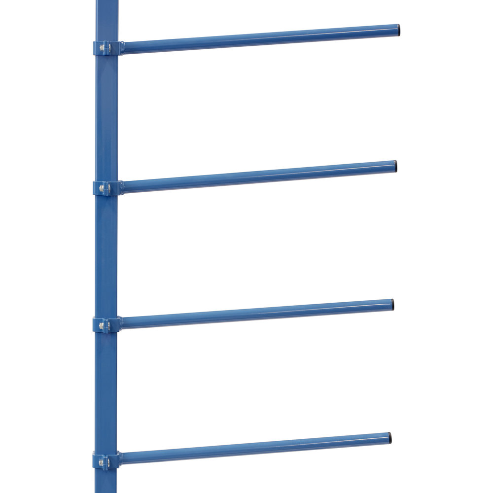 Rahmen aus stabilem Quadratrohr. Rollen-Traversen, Pfosten und Streben durch kräftige Schraubschellen verbunden. Tragarme aus Stahlrohr 27 mm Ø mit Schraubschellen. Einseitig 12 Tragarme 5° geneigt. Nutzlänge 600 mm, Tragkraft pro Etage 80 kg. Tragarmrohre mit PVC-Schlauch 3 mm stark überzogen, als Abrutschschutz und zur Schonung des Ladegutes. Pulverbeschichtet blau RAL 5007. 2 Lenk- und 2 Bockrollen, TPE-Bereifung, Naben mit Rillenkugellager. Feststeller an den Lenkrollen.